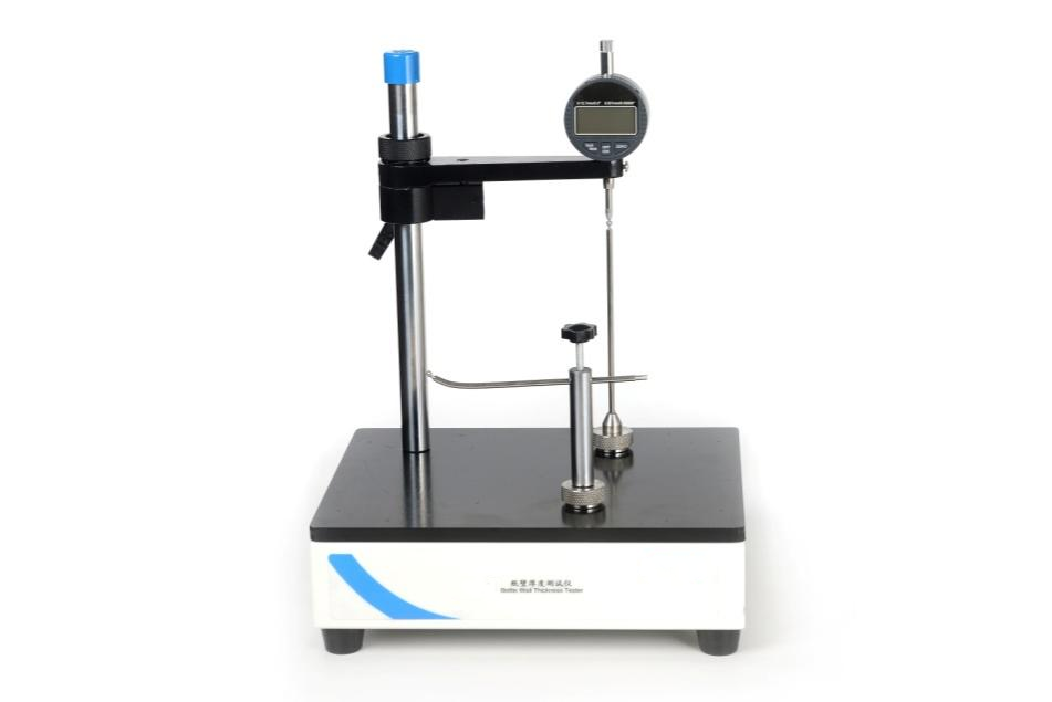 測量表頭和測量桿接觸定位測試零點,放入試樣后,通過測量表頭的相對位移測量瓶子的壁厚和底厚。